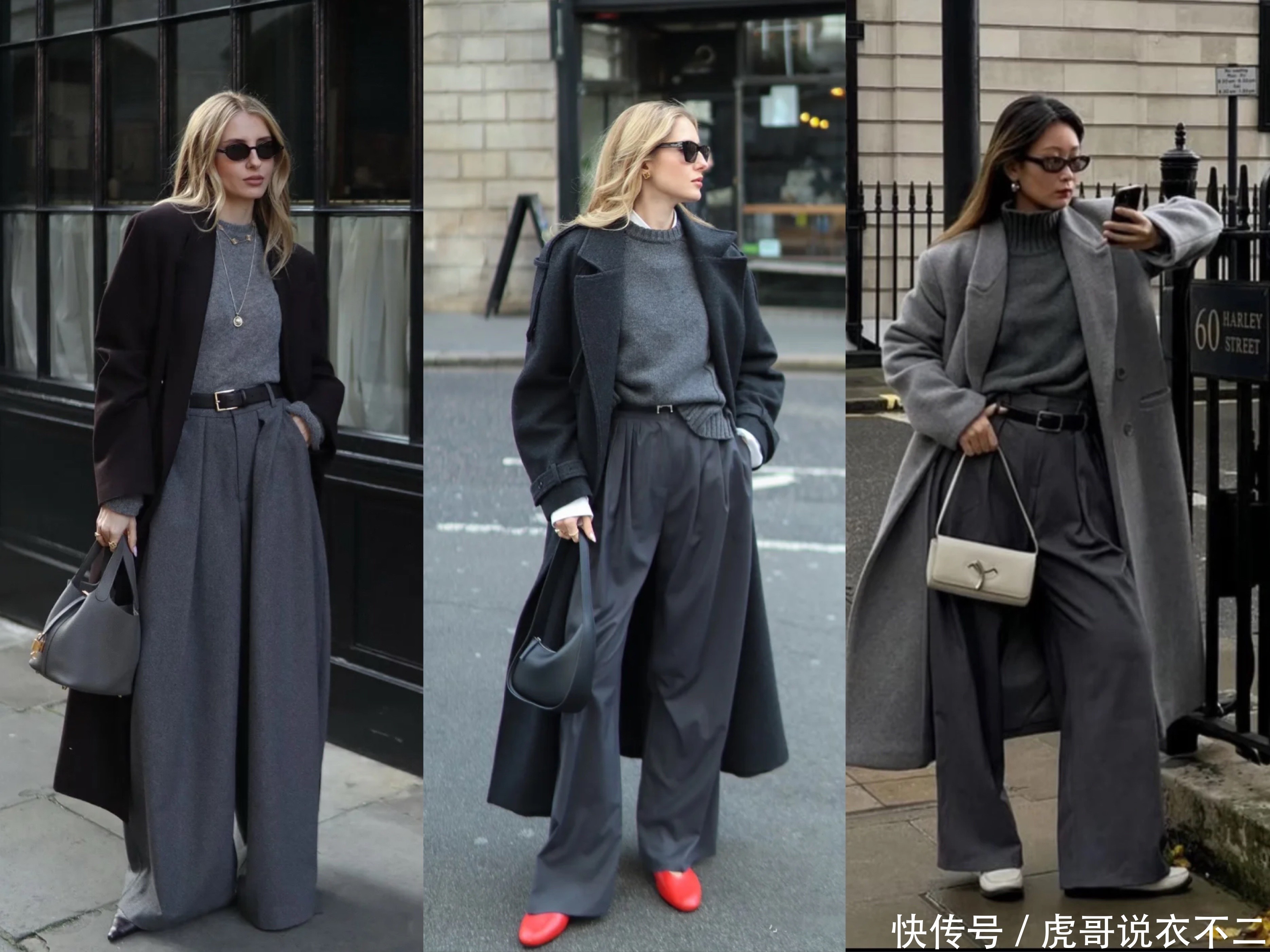 当然,冬季穿搭中最常见的还是灰色与黑色搭配,大衣+羊毛衫+西裤,黑灰色组合,简约大气又带着酷飒,无论是选择直筒西裤,还是阔腿西裤,都推荐高腰款,打造松弛感满满的冬季穿搭,可以适当的选择一些亮色的配饰来点亮造型,比如亮色的鞋子、包包或者金属项链。