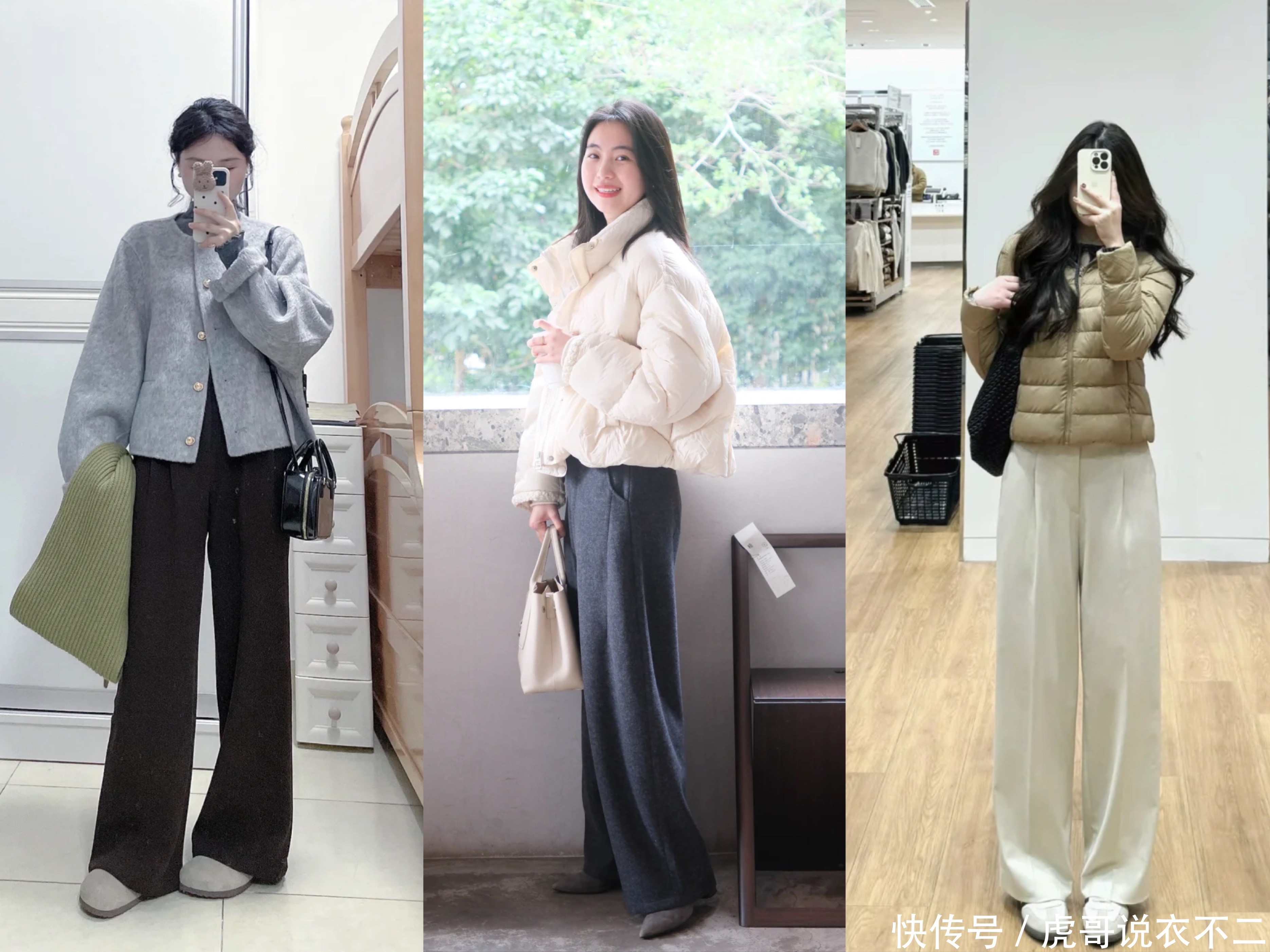 二、短外套+西裤穿搭上短下长是冬季穿搭避免臃肿的穿搭小技巧,毛呢外套、羽绒服等都可以与西裤组合。