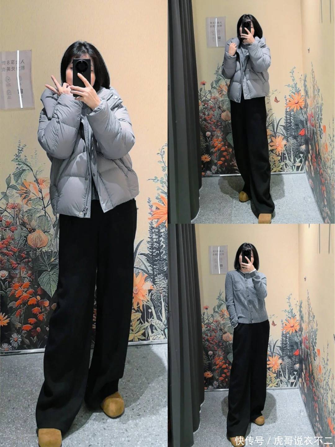 看一组搭配案例,灰色短款羽绒服+黑色高腰西裤,博主选择的是灰色针织开衫叠穿白色打底,上半身同色系,与黑色西裤的对比,上短下长,简约大气,虽然是混搭,但是休闲舒适又简约,非常适合日常穿搭。
