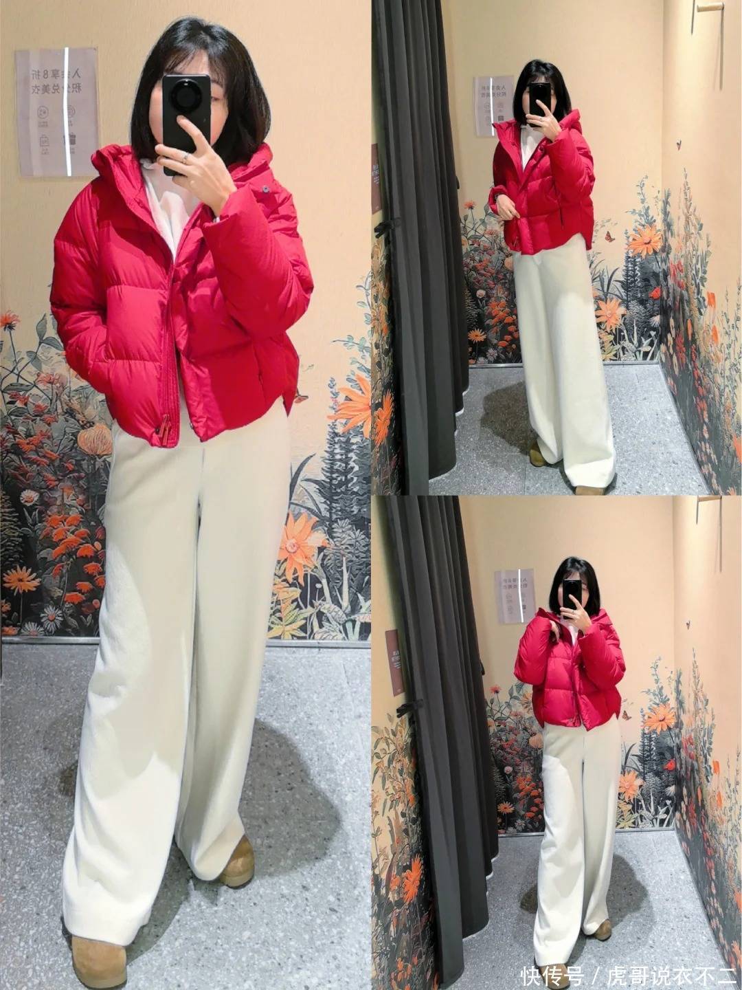 而这套红色羽绒服+米白色西裤的组合就显得更加活力十足,内搭选择白色系毛衣打底,非常的衬肤色,同样也是上短下长的搭配组合,丝毫不会显得拖沓。