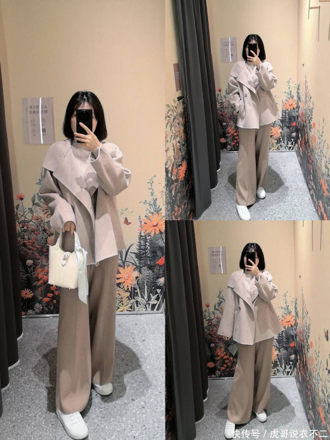 比如选择短款羽绒服时,以宽松的版型为主,与阔腿西裤的搭配,可以打造舒适又保暖的松弛感造型,再比如选择中长款的浴袍式短款毛呢外套,用一根腰带随意扎在腰间,既勾勒出腰线让身材更有曲线感,整体造型又显得非常的松弛且不显臃肿。