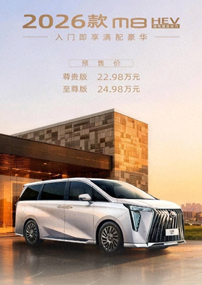 2026款传祺M8 HEV前不久正式开启预售,那新车一共是推出HEV尊贵版和HEV至尊版两个配置车型给到用户选择,预售价格分别是22.98万元以及24.98万元。其实熟悉MPV市场的用户应该都知道,油电混动MPV车型一直以来都是不少家庭用户的购车首选,既拥有媲美插混动力的低出行成本,也不用担心电池续航这些问题,属于是比较省心省钱的选择,所以传祺M8 HEV销量一直都挺稳定的。