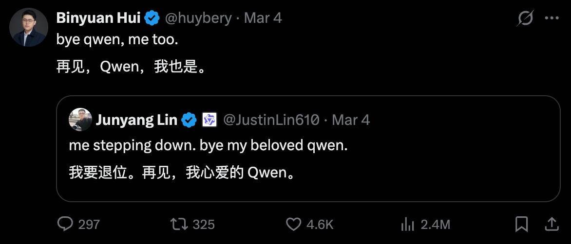 3月4日一天内,阿里千问大模型核心技术层突发变动。3月4日凌晨,阿里巴巴集团千问大模型负责人林俊旸在社交平台X发文称,自己将从千问团队卸任。同天,原Qwen后训练负责人郁博文离职。原千问团队Qwen Code负责人惠彬原(Binyuan Hui)则在林俊旸的发文下留言“我也是”,确认离职,其已于2026年1月离开阿里,加入Meta。