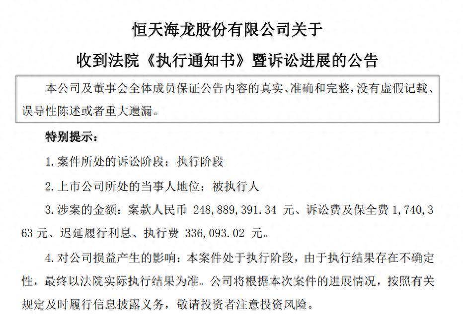 恒天海龙表示,本案件处于执行阶段,由于执行结果存在不确定性,最终以法院实际执行结果为准。