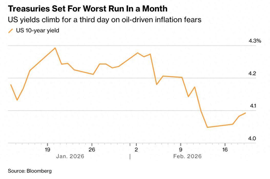智通财经APP获悉,随着美伊紧张局势加剧引发油价走高将推动通胀的担忧,美国国债正迈向一个月来最长的连跌走势。数据显示,美国10年期国债收益率连续第三日上升,上涨1个基点至4.09%。油价周四上涨,延续前一日的涨势。