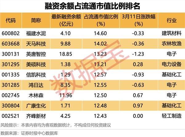 融资余额占流通市值比例最高的是福建水泥,最新融资余额为4.1亿元,占流通市值比例达14.6%。其次是天马科技、英唐智控,融资余额占流通市值比例分别为14.02%、13.23%。