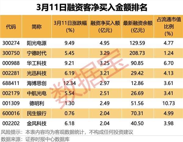 据证券时报·数据宝统计,3月11日,共40股融资净买入额均超1亿元。储能概念龙头阳光电源融资净买入额居首,当日净买入4.95亿元。