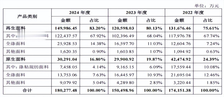 公司的主要产品为生态环保面料,以再生面料为主,其中,再生面料为公司的主要产品,报告期各期,占主营业务收入比分别为75.61%、80.13%和83.20%,占比较高且逐年增长。主要系优衣库、H&M等国际快消品牌在行业整体向绿色环保转型的背景下,对于再生面料的需求不断提升。公司再生面料包括涤粘混纺面料、全涤面料等。报告期内,公司再生面料销售收入主要来自于再生涤粘混纺面料。报告期内,公司再生涤粘混纺面料收入占主营业务收入的比例为67.74%、68.04%和67.92%,为公司的主要产品。